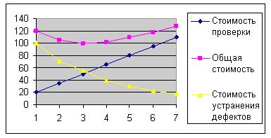 Анализ прибыли и затрат. Цель метода — выдержать необходимое соотношение между доходами и затратами в проекте. Обеспечение качества проекта, несомненно, приводит к дополнительным расходам, поэтому для каждого предложенного метода обеспечения качества необходимо анализировать коэффициент рентабельности. На рис. представлен выбор оптимальной пропорции затрат на профилактику дефектов и устранение дефектов.