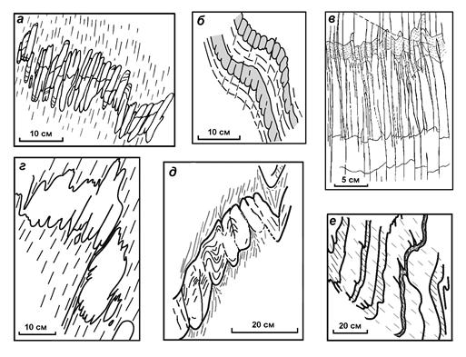 Рис. n. Муллион-структуры: а – зрелые МС в чередовании известняков и филлитовых сланцев; б – правильные МС в слабослюдистых кремнистых породах, чередующихся с мраморизованными известняками: зрелые в более тонком верхнем слое и незрелые – в нижнем; в – правильные МС в чередовании известняков, известковистых и филлитовых сланцев; г – зрелые неправильные МС, развившиеся по с ингенетично нарушенному слою карбонатов в биотитовых сланцах; д – развитие муллионных швов по мелким складчатым неоднородностям в песчаниках; е – начальная стадия развития МС в слоях с признаками сингенетичного нарушения слоистости (мраморы с прослоями известковистых сланцев). а, в – Таласский хр., б, г, д, е – хр. Султан-Уиздаг.