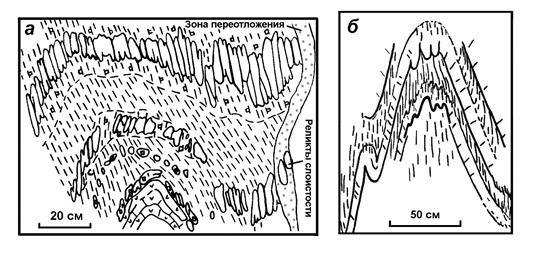 Первые упоминания о муллион-структурах (МС) известны с конца 19 века. Такой знаток малых структурных форм, как Дж. Уилсон [1985], относит их к разновидности грубой линейности и описывает как длинные цилиндрические образования, однако не дает четкого представления о механизме их формирования. Наши наблюдения показывают, что в сечении, перпендикулярном их вытянутой оси, они представляют собой линзы (иногда правильной формы, иногда нет), расположенные поперек слоя и разделенные частично или полностью тонкими темными прокладками (швами), продолжающимися обычно и за пределы этого слоя (рис. n). Эта структура напоминает микролитоны, разделенные кливажными швами, но только не в микроскопическом, а в гораздо более крупном масштабе. МС развиты в вязких слоях – карбонатных или содержащих много кварца. Слой может быть не полностью разделен на линзы (см. рис. nб) и тогда его отпрепарированная поверхность предстает как фестончатая или покрытая желобками.
