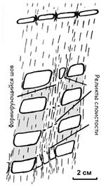 Кливажные швы связаны с наличием вещественных или, реже, структурных неоднородностей микроскопического (внутрислоевого) масштаба. А можно ли найти какие-либо закономерности в расположении муллионных швов? Ответ на этот вопрос очевиден, если швы развиваются в сингенетично нарушенных слоях – они приурочены к границам имеющихся в них неоднородностей (см. рис. n г, е). Развивающиеся в такой ситуации МС имеют неправильную форму и различаются по размеру (см. рис. n г), а иногда даже напоминают конгломераты. Труднее установить причину развития «правильных» МС, когда слой разделен на линзы примерно одинакового размера и формы (см. рис. n в). Однако надо иметь в виду, что слои, даже без сингенетичных нарушений, не являются идеально однородными. Всегда имеются неровности их границ, разная концентрация вязких зерен внутри этих слоев. Под микроскопом можно видеть развитие швов, более крупных, чем кливажные, на вертикальных границах прерывистых слойков, сложенных кварцем или кальцитом. Иногда муллионные швы связаны не с вещественными, а со структурными неоднородностями. Чаще всего они приурочены к замкам мелких складочек (рис. n д). Итак, можно сделать вывод, что появление МС обусловлено неоднородностью деформируемой среды на следующем, более крупном, по сравнению с кливажем уровне, – уровне отдельных слоев.