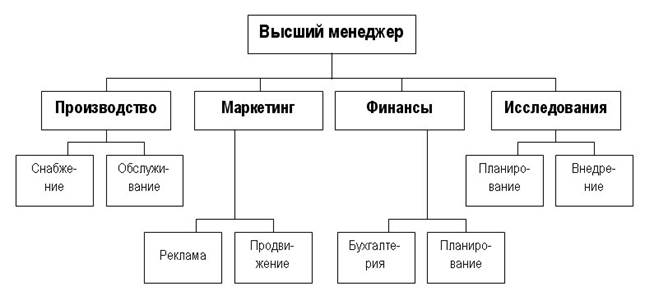 На этой и последующих схемах показаны наиболее обобщенные наименования управляющих лиц и подразделений. Так, то, что на схеме называется высшим менеджером, в реальной организации может быть исполнительным или генеральным директором, президентом и т.д. Во главе функциональной сферы обычно стоит заместитель высшего менеджера (вице-президент), соответственно — по производству (может быть — главный инженер), маркетингу, финансам (главный экономист) и т.д.