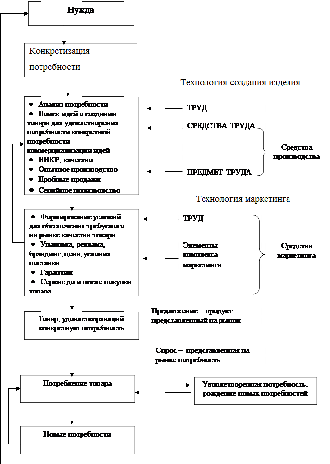 Благодаря деятельности маркетолога технология создания изделия как процесс превращения конкретной потребности в совокупности материализованных в той или иной вещи полезных технико-экономических характеристик интегрируется с технологией маркетинга, процессом создания характеристик окружения этой вещи, продукта, в результате чего создается товарное предложение, которое характеризует спрос, т.е. представленную на рынке потребность в этом продукте.