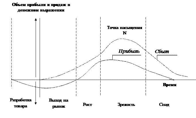 Рис. 2. Изменение объема продаж и прибыли на протяжении ЖЦТ