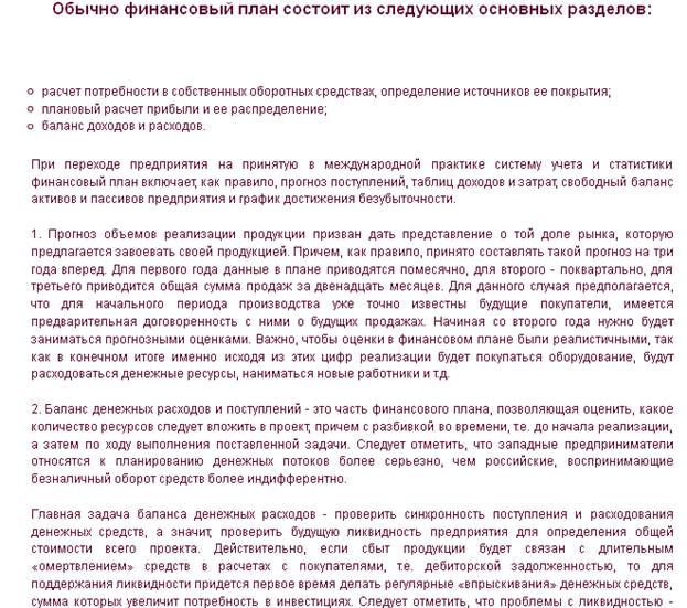 В процессе составления финансового плана определяют источники и объем собственных финансовых ресурсов предприятия, организации (прибыль, амортизация и др.); изучают возможность и целесообразность привлечения финансовых ресурсов за счет выпуска ценных бумаг, получения кредитов, благотворительных взносов и т.д.; выбирают оптимальные для конкретной ситуации формы образования и использования фондов денежных средств, взаимоотношений с бюджетом, банками, вышестоящими органами, своими работниками; устанавливают рациональные пропорции распределения финансовых ресурсов на внутрихозяйственные нужды: расширение и перевооружение производства, материальное стимулирование, удовлетворение социальных потребностей членов трудового коллектива или вложение в другие предприятия и организации (долевое участие в формировании уставных капиталов, покупка ценных бумаг и другие операции на финансовом рынке); определяют целесообразность и экономическую эффективность планируемых капиталовложений; выявляют внутренние резервы производства и повышения его рентабельности на базе имеющихся материальных и трудовых ресурсов, производств, мощностей, а также перспективы внедрения достижений НТП и совершенствования организации и управления производством. Основная форма финансового плана - баланс доходов и расходов.