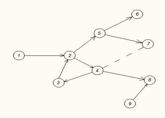 Фиктивные работы, т.е. технологические зависимости, не требующие ни затрат времени, ни затрат ресурсов, пунктирной линией со стрелкой.