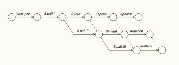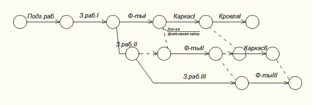 При изображении поточного метода организации работ, т.е. при разбивки объекта на захватки, фронты, необходимо избегать ложных технологических зависимостей, путем введения дополнительных событий и фиктивных работ.