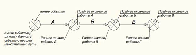 Существуют различные варианты формирования сетевых графиков, наиболее распространенным и отработанным является сетевой график, в котором работа показывается стрелкой, а события (начало и окончание работ) в виде кружочка, разбитого на ряд секторов.