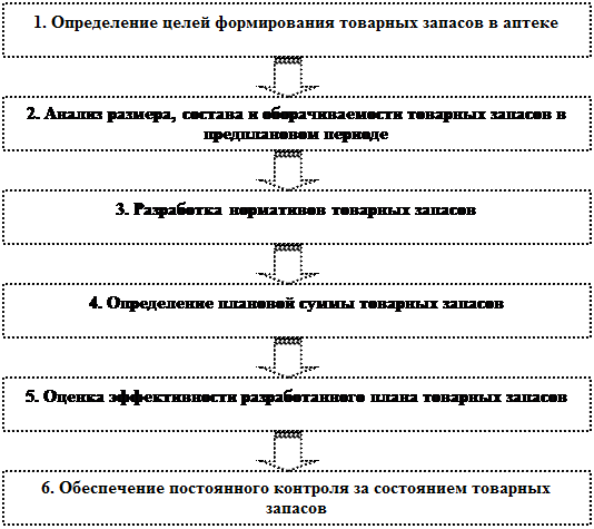 Процесс реализации медикаментов требует постоянного наличия в аптечных учреждениях товарных запасов. Формирование определенных размеров товарных запасов позволяет аптеке обеспечивать устойчивость ассортимента товаров, осуществлять определенную ценовую политику, повышать уровень лекарственного обеспечения населения.
