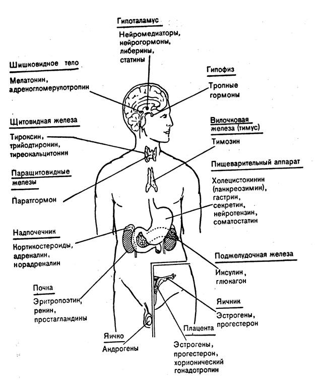 III. по принадлежности к эндокринным железам ( место образования - отдельные органы или группы клеток) – см рисунок ниже