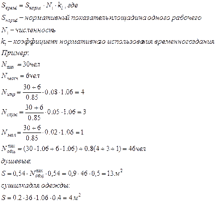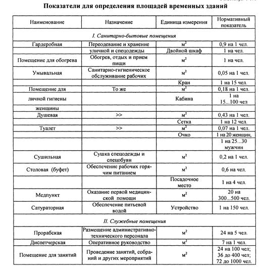 Кроме численности работающих для определения площади временных зданий и сооружений используется нормативный показатель площади на одного работающего в зависимости от назначения временных зданий.