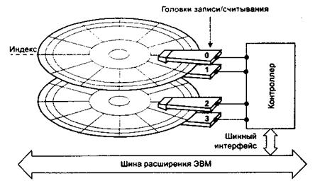 Головки записи/чтения размещены на подвижном каркасе и перемещаются все вместе. Чтение-запись информации в каждый момент времени производится одной головкой. Данные считанные головкой передаются в контроллер, который через шину данных системной магистрали передает их запросившему устройству или процессору.