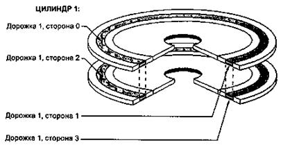 Вращение магнитного носителя дает возможность организовать на нем данные в виде концентрических окружностей, которые называются дорожками. В зависимости от конструкции головки записи-чтения количество дорожек может достигать 2000 и более. Соседние дорожки разделены зазором, который препятствует возникновению ошибок из-за неточности позиционирования головки. В логическом адресе минимального адресуемого блока для записи или считывания с внешнего ЗУ используется понятие цилиндра. Цилиндр – это совокупность дорожек расположенных на каждой из поверхностей дисков на одинаковом расстоянии от центра: