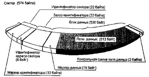 Каждая дорожка в свою очередь разбивается на блоки данных – секторы. В среднем на одной дорожке жесткого магнитного диска размещается от 10 до 100 секторов фиксированной или переменной длины (128, 256, 512, 1024 байт). Сектор имеет сложную структуру, составными элементами которой являются заголовок (идентификатор), область данных и служебная контрольная запись (рис).
