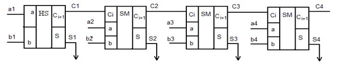 Рисунок 4.5 - Четырехразрядный сумматор, составленный каскадным соединением полных сумматоров.