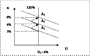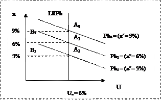 Это обусловливает перемещение экономической системы из положения. Соответствующего точке А1, в точку А2, и затем в точку А3, минуя «семейство» точек В. Вертикальное положение долгосрочной кривой Филлипса (LRPh) показывает, что при наличии рациональных ожиданий естественный уровень безработицы (Un) ни в долгосрочном, ни в краткосрочном плане не чувствителен к изменению общего уровня цен. Поскольку на всем протяжении вертикальной кривой Филлипса ожидаемые и фактические темпы инфляции всегда совпадают, никакие попытки правительства снизить естественный уровень безработицы мерами дискреционной (гибкой, т.е. спад - стимулирующая, сдерживающая – в фазе бума) не венчаются успехом. Необходимо использовать кредитно-денежную политику «по правилам», например, монетарное правило (масса денег в обращении должна ежегодно увеличиваться темпами, равными потенциальному росту реального ВВП (3-5%).