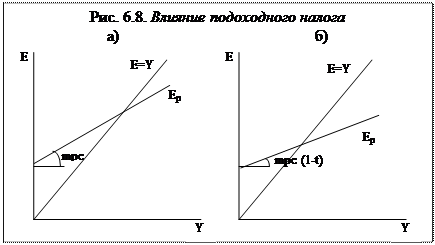 На рис. 6.8а представлена кривая совокупных планируемых расходов при отсутствии ставки подоходного налога, а на рис. 6.8б – при ее наличии.