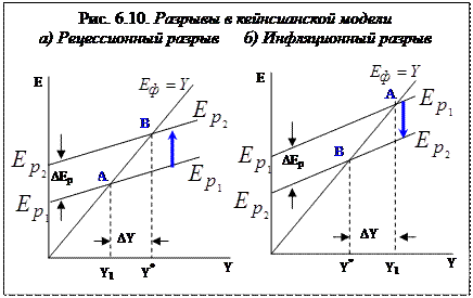 Точка А соответствует равновесию товарного рынка, т. е. ситуации, при которой плани-руемые расходы равны фактическим, расходы равны доходу, а инъекции равны изъятиям. Уровень Y1 представляет собой равновесную величину совокупного дохода (выпуска). Однако эта равновесная величина Y может не соответствовать и, по мнению кейнсианцев, обычно находится ниже уровня ВВП полной занятости, т.е. потенциального ВВП (Y*).