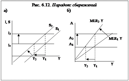 Поскольку в кейнсианской модели сбережения положительно зависят от уровня дохода, а инвестиции – величина автономная, то кривая сбережений имеет положительный наклон, а кривая инвестиций – горизонтальна (рис.6.12а). Рост сбережений ведет к сдвигу кривой сбережений влево-вверх от S1 до S2. Если величина инвестиций не меняется, то рост сбережений ведет к сокращению совокупного дохода (выпуска) от Y1 до Y2. Таким образом, в результате роста сбережений происходит ухудшение экономической ситуации.