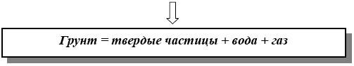 В большинстве случаев грунты состоят из трех компонентов: твердых частиц (твердых тел), воды (жидкого тела) и воздуха или иного газа (газообразного тела), т. е. составные части грунта находятся в трех состояниях: твердом, жидком и газообразном. Соотношение этих компонентов обусловливает многие свойства грунтов.