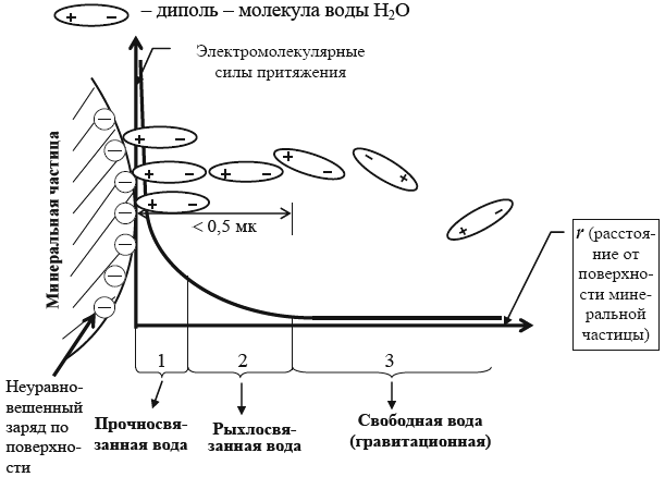 1 – прочносвязанная вода; 2 – рыхлосвязанная вода; 3 – свободная вода.