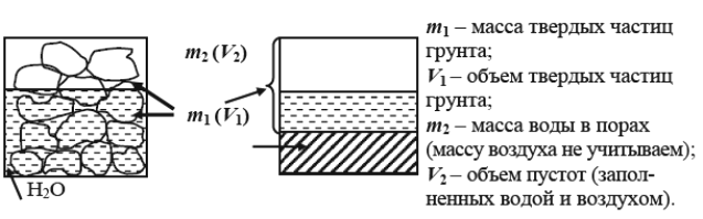 Выделим из грунта образец объемом V = 1 см3 и мысленно разделим его на две части: одну, занятую твердыми частицами, объемом V1 и другую, занятую порами, расположенными между этими частицами, объемом V2 (рис.3). Пространство, занятое порами, можно разделить в общем случае также на две части, одна из которых занята водой, другая – воздухом. Пусть масса твердых частиц в объеме V будет g1, а масса воды – g2 (масса воздуха не оказывает влияния на результаты расчетов).