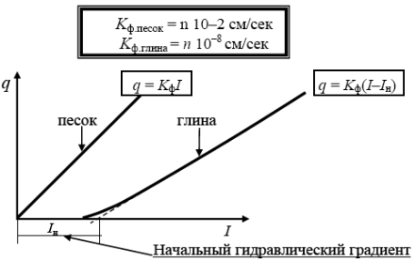 Если принять среднее значение коэффициента фильтрация песка kf = 10-2 см/с и глин kf = 10-8 см/с, то окажется, что при одном и том же градиенте за одно и то же время вода пройдет в песке путь в 10 км, а в глине — в 1 см.