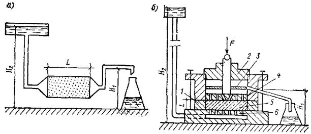 Для хорошо фильтрующих грунтов kf определяют с помощью прибора (рис. 7, а), состоящего из трубы длиной L, заполненной грунтом, и двух трубок – подводящей и отводящей воду. При разности напоров Н2–Н1 вода будет фильтроваться под действием градиента i. Определив объем воды в колбе V, профильтровавшейся за время t, можно найти