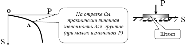 В связи с этим возникает вопрос, в каких случаях допустимо с некоторым приближением использовать решения теории упругости для определения напряжений и деформаций грунтов под действием внешних нагрузок. Для выяснения этого рассмотрим перемещения фундамента (штампа) в случае его загружения статической нагрузкой.