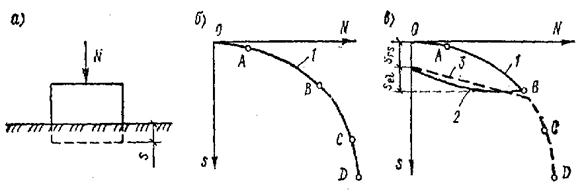 Пусть на поверхности грунта, обладающего структурной прочностью, установлен жесткий штамп, загружаемый нагрузкой N (рис. 6.1, а). Под действием этой нагрузки в массиве грунта происходят перемещения, величина которых будет возрастать по мере увеличения давления на основание. Вследствие развития в грунте дополнительных напряжений сверх ранее существовавших (от действия собственного веса грунта) он будет деформироваться. Интегральным выражением деформаций является осадка штампа S. При увеличении нагрузки осадка развивается в соответствии с кривой 1, приведенной на рис. 6.1, б.