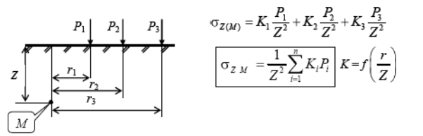 Если к поверхности изотропного линейно-деформируемого полупространства приложено несколько сил (P1, P2, P3 на рис. 6.3), то при прямой пропорциональности между напряжениями и деформациями можно использовать принцип суперпозиции и найти значение σZ в любой точке М простым суммированием: