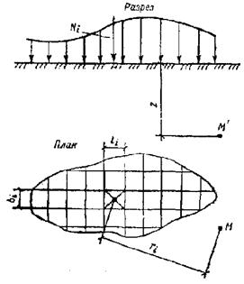 Пусть к поверхности изотропного линейно-деформируемого полупространства в пределах площади А приложено распределенное давление (рис. 6.4, а). Загруженную площадь можно разбить на небольшие прямоугольники со сторонами bi и li более сложные фигуры по ее контуру. С некоторым приближением давление, распределенное в пределах i-го прямоугольника, можно заменить равнодействующей N1, приложенной в центре тяжести этого давления. Вертикальное сжимающее напряжение от действия силы Ni составит