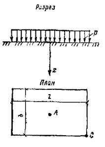 Рис. 6.4. Схемы к расчету действия равномерно-распределенного давления в пределах прямоугольной площадки загружения.
