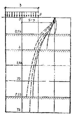 Приведенные выше решения справедливы, когда деформируемая толща грунтов относительно однородна. Если же она сложена из двух или большего числа слоев грунта, обладающих существенно неодинаковой сжимаемостью (различающейся в несколько раз), то это обстоятельство иногда приходится учитывать при расчете. При наличии подстилающего слоя, практически несжимаемого, происходит некоторая концентрация напряжения σZ по оси загрузки, которая больше при меньшем расстоянии от жесткого слоя до загружаемой поверхности (сплошные эпюры на рис. 6.9). Если подстилающий слой обладает значительно большей сжимаемостью, чем несущий, наблюдается, наоборот, рассеивание напряжений на большую площадь и уменьшение σZ по оси нагрузки (штриховые эпюры на рис. 6.9). Штрихпунктиром показана эпюра напряжения σZ в линейно-деформируемом полупространстве.