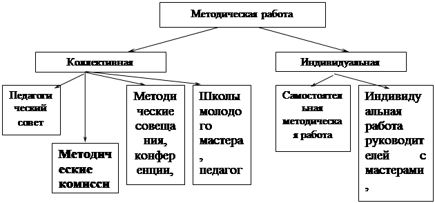 Существуют разнообразные формы проведения методической работы в училищах, которые можно разделить на два вида: коллективные, проводимые для всех педагогических работников или для группы педагогических работников и индивидуальные, проводимые с отдельными мастерами ПО и преподавателями (рис. 1).