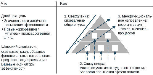 - «сверху вниз» — установление руководством основного курса изменений с целью концентрации всеобщего внимания на проблеме повышения эффективности и создания условий для ее решения;