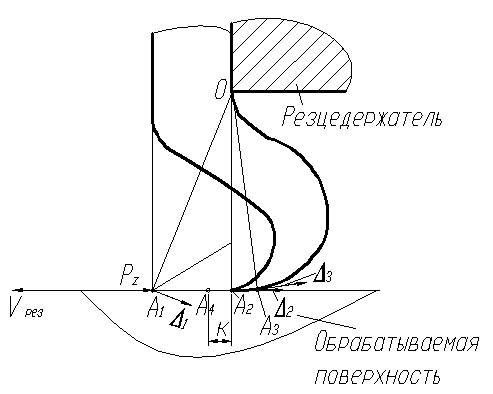 Для положения вершины резца в точке А1 вектор деформации под действием силы Рz - ∆1 будет направлен в «тело» обрабатываемой поверхности, что приведет к изменению глубины резания и возникновению вибраций – к снижению качества обработки и стойкости РИ. Для исключения этого недостатка вектор деформации в точке А должен быть параллельным обрабатываемой поверхности, что будет иметь место в точке А2.В этом случае державка резца должна быть выполнена изогнутой. Однако под действием средней составляющей силы Рz (рис.44) вершина резца переместиться в точку А3 и вектор деформации будет направлен вверх, что также приведет к изменению толщины резания и вибрации. Для исключения этого недостатка вершина резца в исходном состоянии без нагрузки должна быть расположена в точке А4 на некотором расстоянии к от точки А2, где к- величина перемещения вершины резца под действием средней составляющей силы Рz, которая зависит от различных факторов и в среднем составляет 1-1,5 мм.