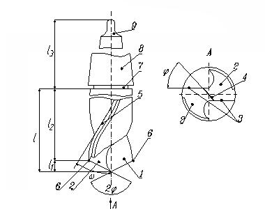 l – рабочая часть, включающая в себя режущую и направляющую части; l1 - режущая часть, имеющая главные режущие кромки 3; l 2 – направляющая часть, имеющая ленточки 5 и стружечные винтовые канавки и служит для направления сверл в отверстие; l 3 – крепежная часть (состоит из шейки 7, хвостовика8, лапки 9); 1 – передняя поверхность; 2 – главная задняя поверхность; 3 – главная режущая кромка; 4 – поперечная кромка (перемычка) – определяет жесткость и прочность сверла и отрицательно сказывается на процесс сверления из-за отрицательного переднего угла на данной кромке; 5 – ленточка, часть которой (длиной