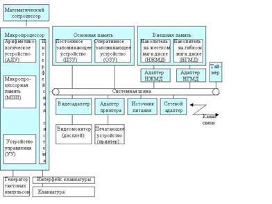 Дополнительные схемы. К системной шине и к МП ПК наряду с типовым внешними устройствами могут быть подключены и некоторые дополнительные платы с интегральными микросхемами, расширяющие и улучшающие функциональные возможности микропроцессора: математический сопроцессор, контроллер прямого доступа к памяти, сопроцессор ввода-вывода, контроллер прерываний и др.