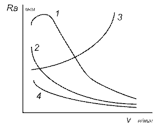 | Рисунок 1.5 Зависимость шероховатости от скорости резания. 1-перлитно-ферритные стали; 2-коррозионно-стойкие и жаропрочные стали; 3-легкоплавкие сплавы; 4-среднеуглеродистые стали. |