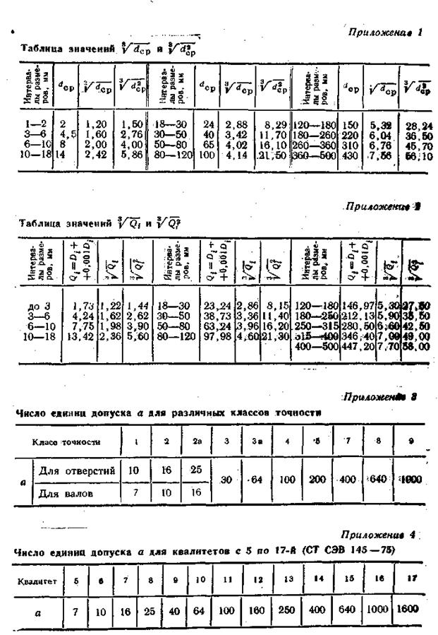 Допуски на составляющие размеры обычно (особенно при небольшом числе звеньев в размерной цепи) назначают методом подбора, используя значения, приведенные в ГОСТ 25347-82. Средняя точность по квалитету составляющих звеньев может быть определена по уравнению (1.1)