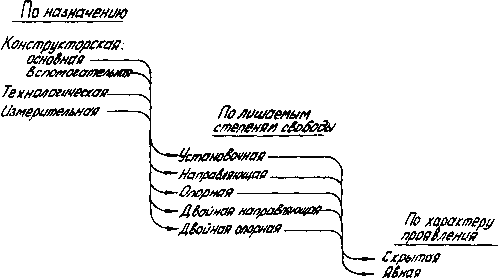 По числу лишаемых степеней свободы базы различают: установочную, направляющую, опорную, двойную направляющую, двойную опорную. Характеристики этих баз были рассмотрены выше при изучении базирования различных деталей.