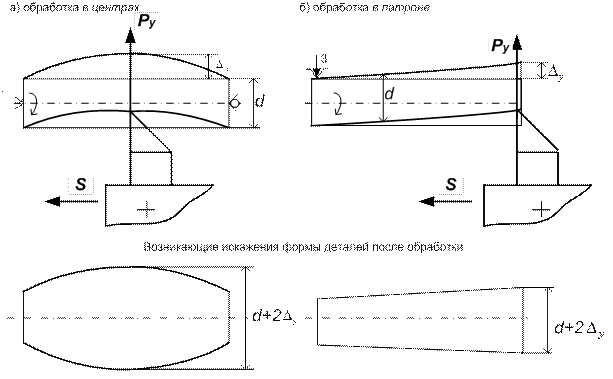 На рисунке 3.1 представлены две схемы обработки цилиндрической детали: с закреплением в центрах («а») и в трехкулачковом токарном патроне («б»), которые иллюстрируют возникающие упругие деформации