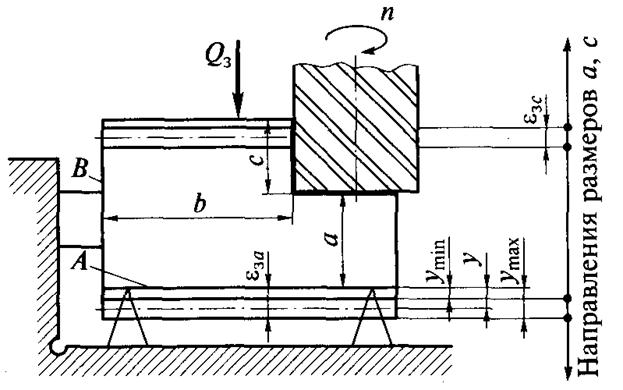 Погрешности закрепления. Перед обработкой заготовку устанавливают в приспособление и плотно прижимают ее базовыми поверхностями к установочным элементам (опорам) приспособления. Сила Qj закрепления должна быть достаточной, чтобы исключить в процессе обработки сдвиг, колебания или вибрации заготовки. Одновременно под действием силы Q3 возникают упругие деформации заготовки, опор и других деталей приспособления, а также контактные деформации стыков поверхностей, через которые передаются силы зажима. Названные деформации приводят к смещению установочных и измерительных баз относительно выставленного на размер инструмента. Настроечные размеры изменяются.