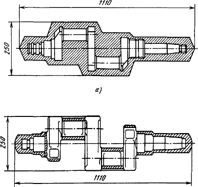 Если получить готовую деталь непосредственно из полуфабрикатов не удается, наибольший эффект дает максимальное приближение форм и размеров заготовки к готовой детали. Примером может служить сопоставление масс заготовок коленчатого вала, одна из которых, полученная свободной ковкой (рис.23.3 а), имеет массу 163 кг, а другая, полученная штамповкой в закрытых штампах (рис.23.3 б), имеет массу 87 кг. Трудоемкость механической обработки заготовки при одинаковом объеме выпуска и на том же оборудовании в первом случае составляет 40,6, а во втором – 19 нормо-часов, т.е. сокращается на 59%.
