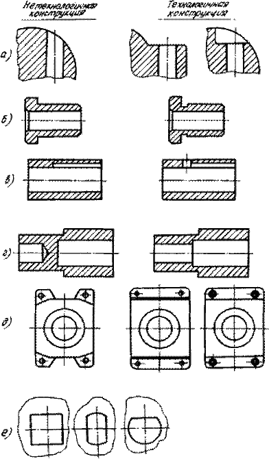 Рис. 24.2. Примеры нетехнологичных и технологичных конструкций деталей