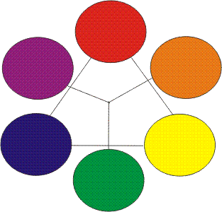 Треугольник показывает три основных цвета, которыми пользуются художники. Остальные цвета (оранжевый, зеленый, фиолетовый) получаются путем смешивания основных.