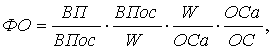 Данная формула позволяет определить влияние на динамику фондоотдачи изменения уровня специализации предприятия (ВП/ВПOC); коэффициента использования производственной мощности (ВПOC/W); фондоотдачи активной части ОС, исчисленной по производственной мощности (W/OCa); доли активной части фондов в общей их стоимости (ОСа/ОС).