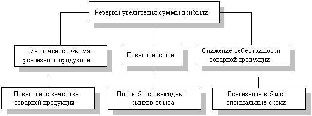 Резервы увеличения суммы прибыли определяются по каждому виду товарной продукции. Основными их источниками является увеличение объема реализации продукции, снижение ее себестоимости, повышение качества товарной продукции, реализация ее на более выгодных рынках сбыта и т.д. (рис.15)