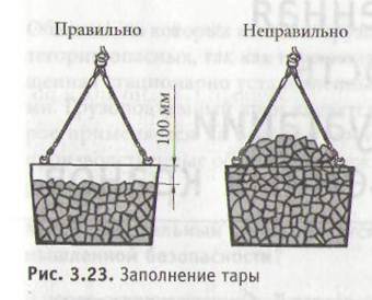Тара должна заполняться только тем материалом, для которого предназначена. Заполнение тары материалом с большей удельной массой может стать причиной перегрузки крана или разрушения тары.