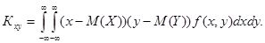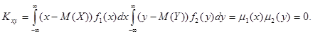 Корреляционный момент описывает связь между составляющими двумерной случайной вели-чины. Действительно, убедимся, что для независимых Х и Y Kxy = 0. В этом случае f (x,y) = =f 1(x) f 2(y), тогда